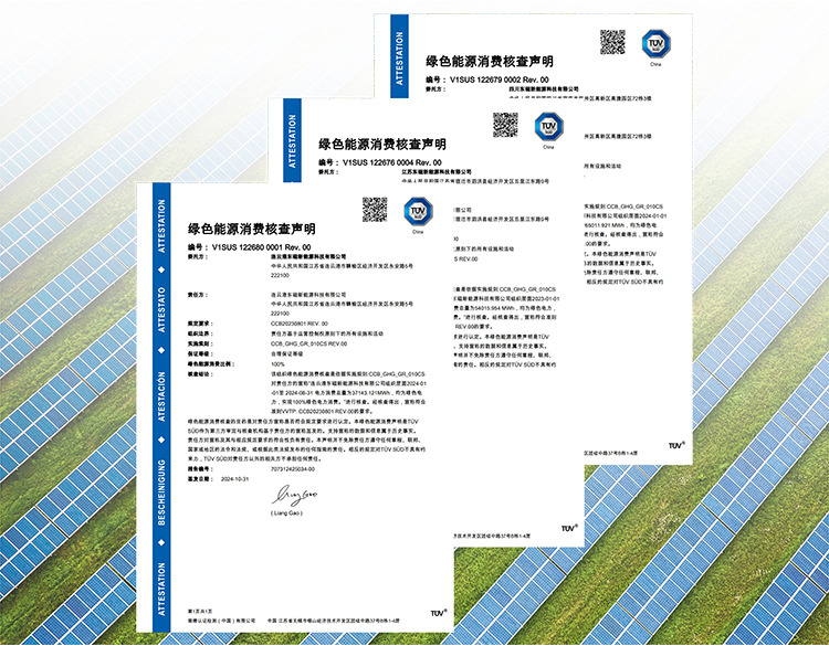 11月1日 ,横店6731顶级游戏太阳能连云港基地获得T?V南德意志集团(以下简称“T?V 南德”)揭晓的ISO14068组织碳中和告竣核查声明证书 ,为T?V南德在光伏行业揭晓的首张该类证书。同日 ,横店6731顶级游戏泗洪、连云港和宜宾3个基地还获得组织温室气体核查声明和绿色能源消耗核查声明。