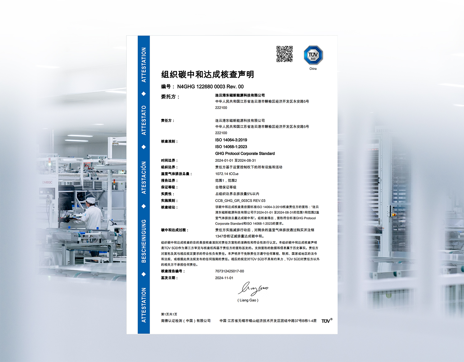 ISO 14068是ISO 14060系列首个碳中和标准。在此次认证中 ,T?V南德依据响应标准 ,对连云港基地举行了组织碳中和核查。核查效果显示 ,该基地妄想并接纳了有用减排步伐 ,通过购置国际自愿减排项目碳信用举行足额抵消 ,实现了碳中和 ,成为了名副着实的“碳中和工厂”。